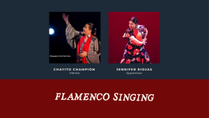 Renowned flamenco singer Chayito Champion began singing at an early age, carrying on her family’s flamenco legacy. She was given the nickname ‘Gitana Americana’ by the late Antonio Montoya, El Farruco. Her recent engagements include: Repertorio Español, Thalia Theatre, Carnegie Hall and Lincoln Center in New York City. She is the singer for Jácome Flamenco and Carlota Santana Flamenco Vivo. She has toured the world with such artists as the late Jose Greco, Antonio Vargas, Teo Morca, Antonio Vargas and Pilar Rioja.