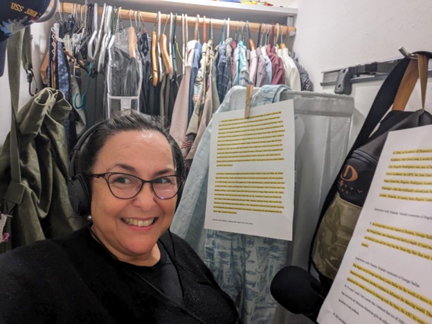 Next, I had to write and record my narration. I used my son’s closet where I covered surfaces with blankets and used clothespins to clip up my manuscripts to read from. I used the field recorder from Texas Folklife to make the recordings.