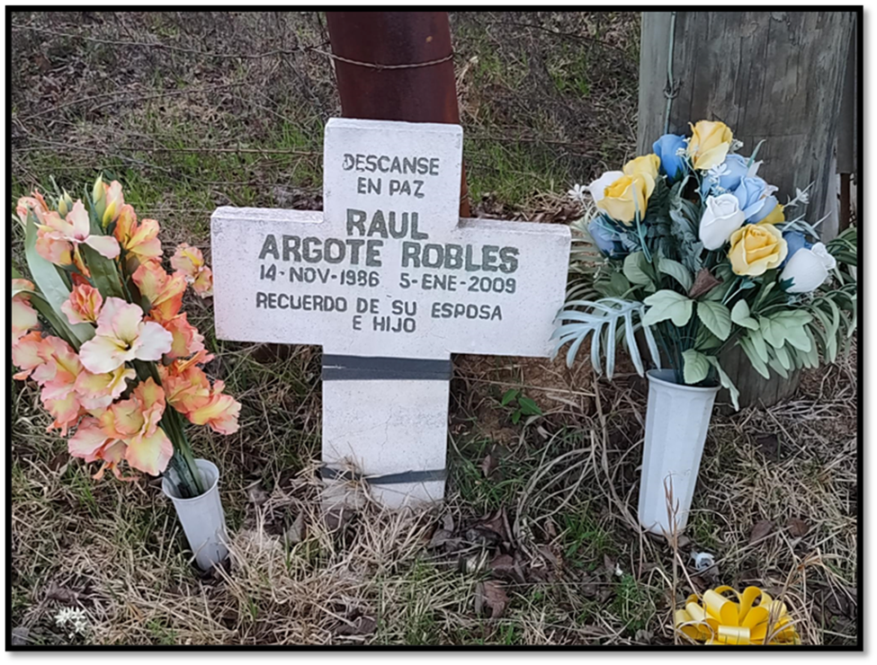 One practice that has stood the test of time is the tradition of setting descansos or memorials to honor those who lost their lives while on the road. The tradition has changed over time. When traveling individuals died, they often had to be buried where they died. Those remaining placed a cross to mark the grave site. “Today, from California to Texas, a descanso may mark the spot where a person was killed in a car accident.  These descansos may be marked by a large cross, or a small tombstone with plastic flowers, or even a photograph stapled to a cross, anything to identify the spot with the image of the person who died there.”[1]
