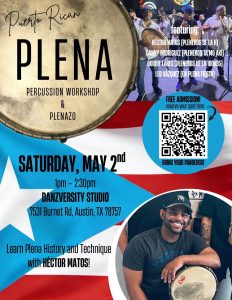 Join us for an exciting in-person workshop where you’ll learn plena history and pandero technique from our team of seasoned pleneros led by Héctor Matos (Houston), with Danny Rodríguez of Pleneros Ta’mo Akí (San Antonio), Enrique Quiñones Arocho ‘Quique Lares’ of Pleneros de la 100×35 (DFW), and Leo Vázquez of En Plena Fiesta (Killeen).